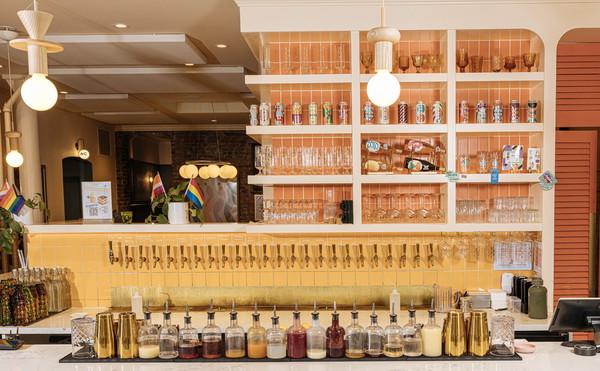 Der Schankraum von Talea sieht aus wie die „Streusel auf einem Geburtstagskuchen“, sagt Co-Gründerin LeAnn Darland – der Barbereich ist gefliest in Orange, Gelb und einem tiefen Lila. Im hinteren Bereich der Bar befindet sich eine stimmungsvolle Lounge in Dunkelblau mit samtenen Sesseln, die sich um kleine Couchtische drapieren. Lampen aus Zinn kreieren ein schummriges Licht, doch die gerahmten Illustrationen an den Wänden wirken einladend und freundlich.