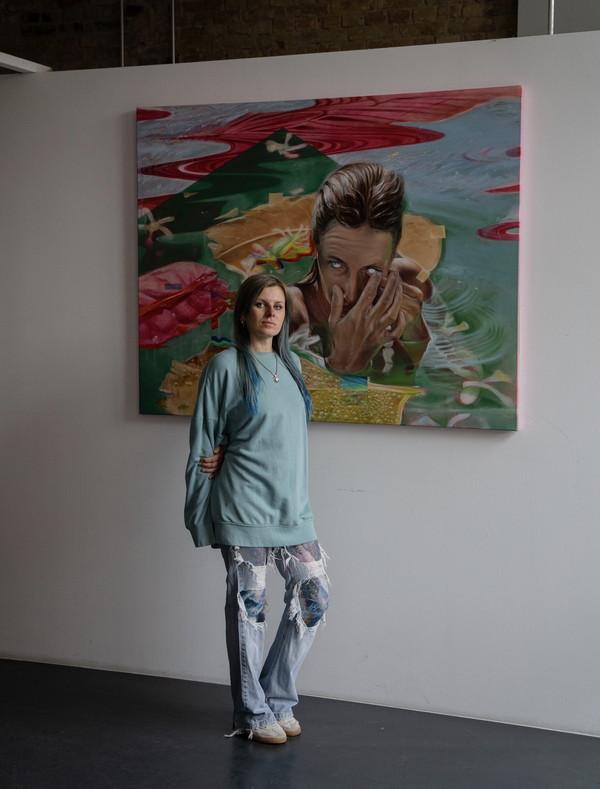 Das Gemälde, das wir für unsere diesjährige Under 30-Kampagne gewählt haben, ist ein Porträt einer Frau, die Bengard in ihren jungen Jahren in Berlin kennenlernte. „Sie ist ein bisschen ein Freigeist“, so Bengard. Was heisst das aus dem Mund einer Künstlerin, die Fetische malt? „Sie packte zwei Koffer, keine grossen, verkaufte alles andere und ging auf Reisen.“ Heute lebt diese Frau mit ihrem Mann und ihren Kindern auf einer Ranch in Nicaragua (durch regenerative Landwirtschaft wollen sie das Land wiederbeleben, betont Bengard), wo die Künstlerin sie vor ein paar Jahren besuchte: „Sie hatte dort einen Pool, und der Pool war kaputt und voller Schmutz und Blätter und Insekten. Es war widerlich. Und sie ist reingesprungen.“ Es machte sich ein Gefühl von Unbehagen in ihr breit, erzählt die Künstlerin über den Moment – also schoss sie ein Foto. Erst Jahre später malte sie die Serie mit ihrer Freundin.