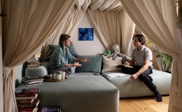Anne Bengard empfängt uns in ihrer Wohnung in Berlin-Schöneberg. An den Wänden hängen und lehnen Dutzende Gemälde – viele von ihnen zeigen eng umschlungene Paare oder Gesichter, aus deren Mündern (oder in sie hinein?) Hände wachsen und Schmetterlinge fliegen. In einer Ecke in ihrer Küche sind gut 100 Sprühdosen gestapelt und fein säuberlich nach Farben sortiert. Bengard reicht uns eine Tasse Kaffee: „Ich trinke selten einen. Es kann sein, dass er viel zu stark ist.“ Ihre Wohnung ist gleichzeitig ihr Atelier; hier lagert die 37-Jährige ihre Gemälde, malt und lebt.