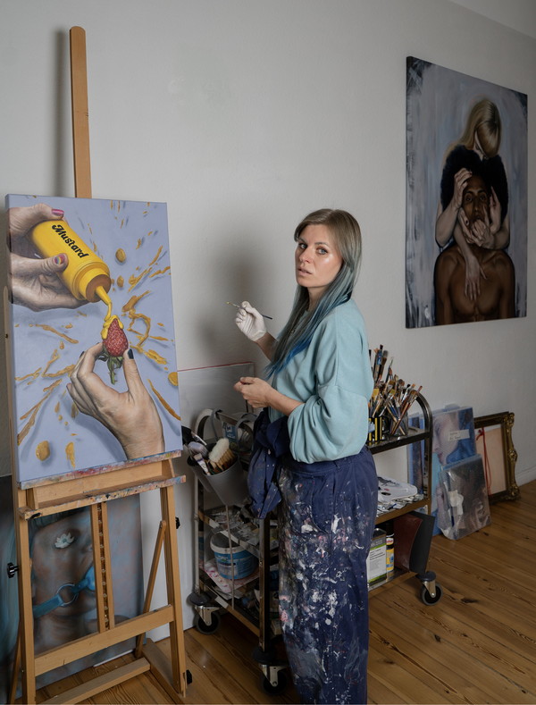 Die Einflüsse aus der Londoner Fetisch-Szene sind leicht zu erkennen: Ein Bild in ihrem Wohnzimmer zeigt einen Mann mit schwarzen Locken; seine Schultern sind nackt, in seinem Mund steckt ein Schmetterling. Ein weiteres: Derselbe Mann, wieder mit nacktem Oberkörper; eine Frau umarmt ihn von hinten, nimmt seinen Kopf in ihre Hände. Eine Hand verschwindet in seinem Mund, die andere in seiner Brust. Auf beiden Bildern schaut der Mann den Betrachter direkt an, seine Augen sind halb geschlossen, als wäre er in Trance. Eine andere Serie zeigt in Latex gekleidete Frauen, die in Seifenblasen gefangen sind. Wieder eine andere Bildreihe – eine Frau mit schulterlangen Haaren, in Fesseln. „Es geht aber nicht nur um Latex und Peitschen und Ketten, das ist der visuelle Teil“, so die Künstlerin – sie versucht, die Psychologie hinter Fetischen zu erforschen: „Warum sind Menschen von Dingen besessen? Wenn ich so etwas male, sehe ich, dass andere Verhaltensweisen wie das Sammeln von Kunst oder Sneakern auch zur Besessenheit werden können; dass wir normalen Dingen so eine grosse Bedeutung beimessen und ihnen so viel Macht über uns geben.“