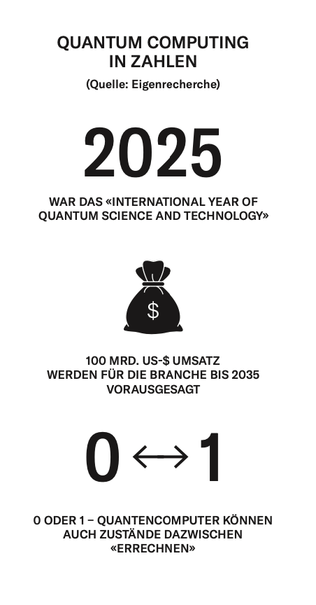 Etwas vereinfacht erklärt beruht unsere digitale Welt auf einem einfachen Prinzip: 0 oder 1. Klassische Computer arbeiten mit Bits, die ausschliesslich einen dieser beiden Zustände annehmen können. Doch die Realität funktioniert selten binär – sie ist geprägt von Unsicherheit, Zwischentönen und Wahrscheinlichkeiten; etwas, das selbst Supercomputer nur begrenzt abbilden können. Genau an diesem Punkt setzt die Quantenmechanik an. Quantencomputer arbeiten mit sogenannten Qubits, die nicht nur 0 oder 1 sein können, sondern beides zugleich. Diese Eigenschaft, Superposition genannt, erlaubt es, Rechenoperationen durchzuführen, die Unsicherheit direkt miteinbeziehen.
