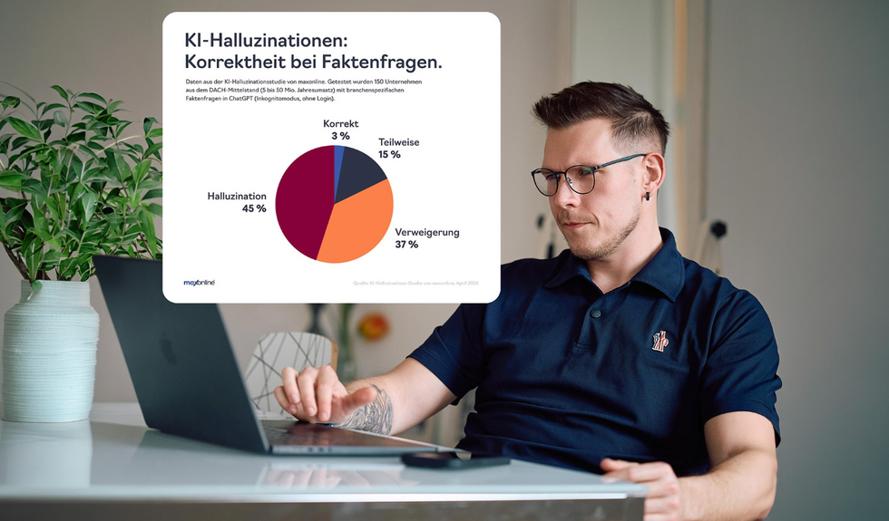 Falsche und erfundene Fakten der KI: Genau dieses Szenario hat die Agentur maxonline® zwischen März und April 2026 in einer empirischen Studie systematisch untersucht. 150 mittelständische Unternehmen aus Österreich, Deutschland und der Schweiz, verteilt auf elf Branchen, wurden mit über 450 standardisierten Prompts auf ihre KI-Darstellung geprüft. Die Ergebnisse übertrafen unsere schlimmsten Erwartungen. Lediglich vier von 150 Unternehmen wurden von ChatGPT vollständig korrekt beschrieben. Bei 45 Prozent schrieb die KI konkrete Falschinformationen, Gründungsjahre mit Abweichungen von über 160 Jahren, erfundene Zertifizierungen, fiktive Unternehmensgeschichten. Bei weiteren 37 Prozent verweigerte sie jede Aussage.