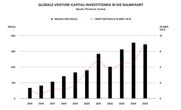 Innerhalb der Raumfahrtbranche ist der Einfluss von Space X indes unbestritten. Investoren sagen, das Unternehmen sei massgeblich verantwortlich für die regelrechte Explosion der Investitionen in Raumfahrttechnologie, die 2025 auf den Rekordwert von 10,7 Mrd. US-$ gestiegen sind – nahezu doppelt so viel wie 2020. Mindestens 1,4 Mrd. US-$ davon flossen an Unternehmen von Space-X-Alumni. Der Grund: Space X hat die Kosten gesenkt, die Startfrequenz erhöht und den Zugang zum All damit radikal demokratisiert, was völlig neue Geschäftsmöglichkeiten eröffnet hat. Space X brachte dieses Jahr 165 Raketen ins All – 2018 führten alle US-Raumfahrtunternehmen zusammen nur 42 Starts durch, davon waren 21 von Space X. Im Dezember unterzeichnete Präsident Trump zudem eine Executive Order, die mindestens 50 Mrd. US-$ an zusätzlichen Investitionen in die Raumfahrt bis 2028 vorsieht. «Der einzige Grund, warum wir heute überhaupt über Raumfahrt als Investmentkategorie sprechen, ist Space X», sagt Chad Anderson.